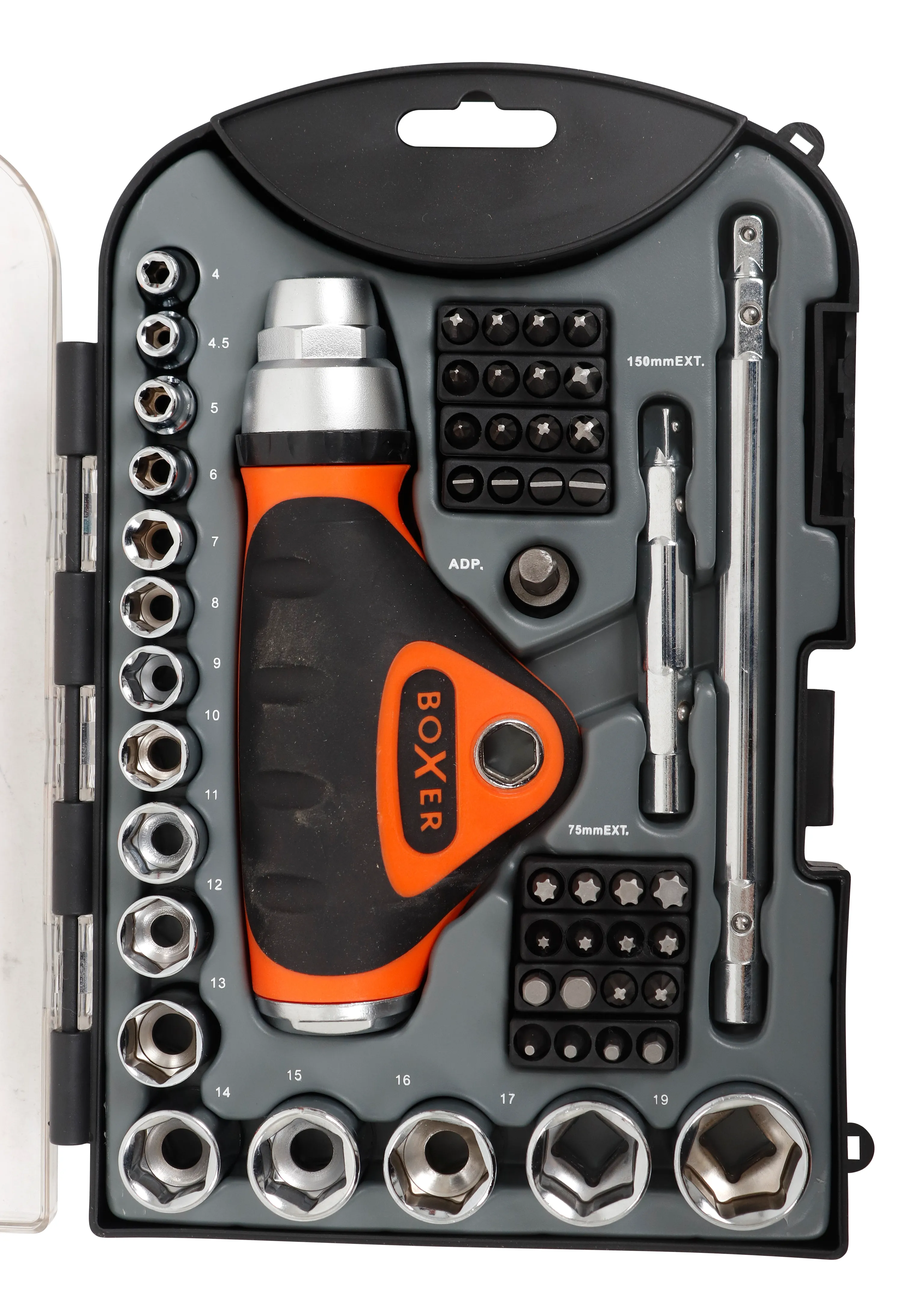 Cand se construiesc sau se renoveaza spatii, diferite etape si lucrari necesita suruburi si accesorii de dimensiuni diferite. Utilizarea unei truse complete de chei tubulare si biti permite adaptarea rapida la fiecare tip de prindere, fara intreruperi sau improvizatii in timpul lucrului.Aceasta trusa de chei tubulare Boxer contine 10 tubulare de 1x4â cu dimensiuni intre 4 si 12 mm si 6 tubulare de 3x8â cu dimensiuni intre 13 si 19 mm. Setul este completat de 2 adaptoare prelungitoare, de 75 mm si 150 mm, precum si de un adaptor biti de 3x8", care permit utilizarea componentelor in diferite configuratii, in functie de necesitati.In completare, trusa de biti include 8 biti PH, 4 biti PZ, 4 biti LK, 8 biti hexagonali offset si 8 biti TORX, acoperind cele mai utilizate tipuri de capete. Manerul de surubelnita cu clichet este inclus pentru operatiuni de insurubare controlata. Acest set biti si tubulare, format din 52 de piese, este organizat intr-o cutie practica, care permite accesul rapid la fiecare componenta si pastrarea ordonata a uneltelor.